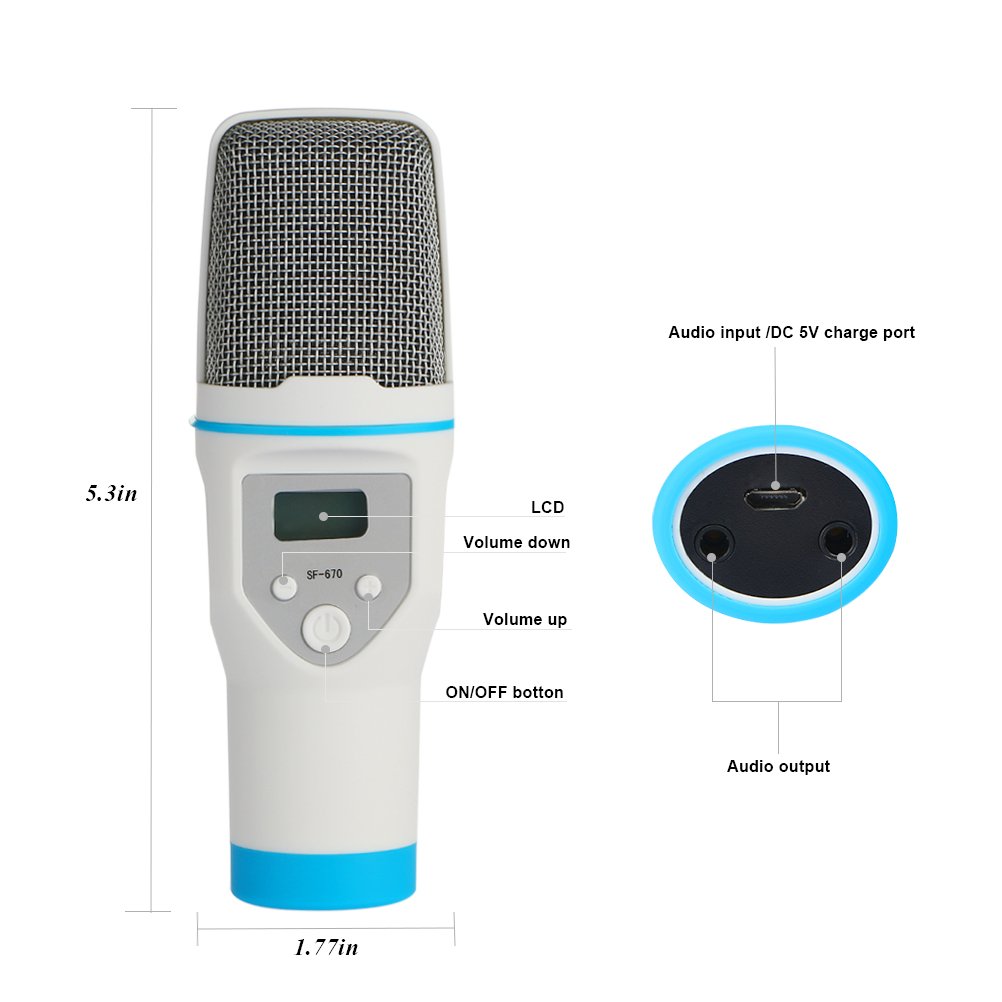 軽量で小型、充電池内蔵で独立して使えるマイク。USB接続とAUX接続両方対応しているが、AUXのほうはリバーブが強くかかっていて、カラオケマイクのようになっている。AUX出力部分にイヤホンを接続し、自分の声を確認しながら録音できるのが最大の魅力。